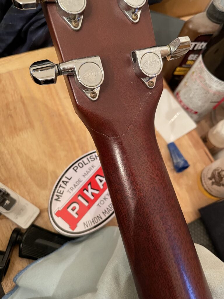 しっかりヒビが入ってますね。オーナーさんが一度ネックを折ってしまい修理したそうですが、同じところがまた折れ、自身でタイトボンドを使って接着したとのこと。