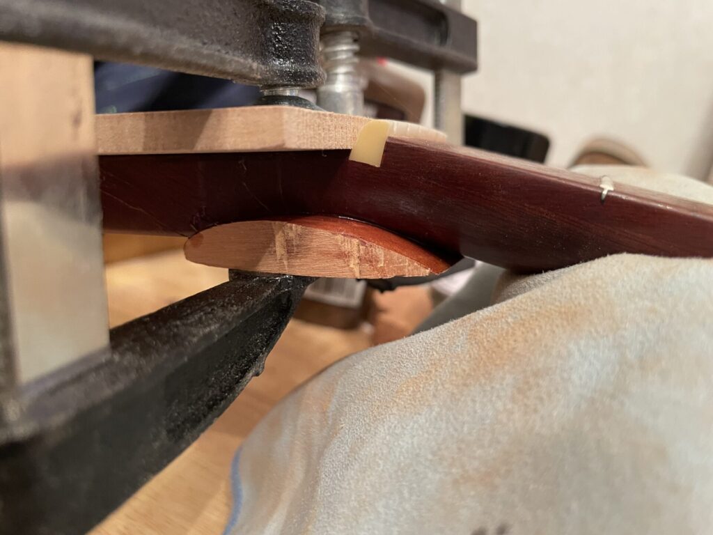 次に、削った箇所にピッタリ合うように当て木を作ってクランプでしっかりと1日以上接着します。