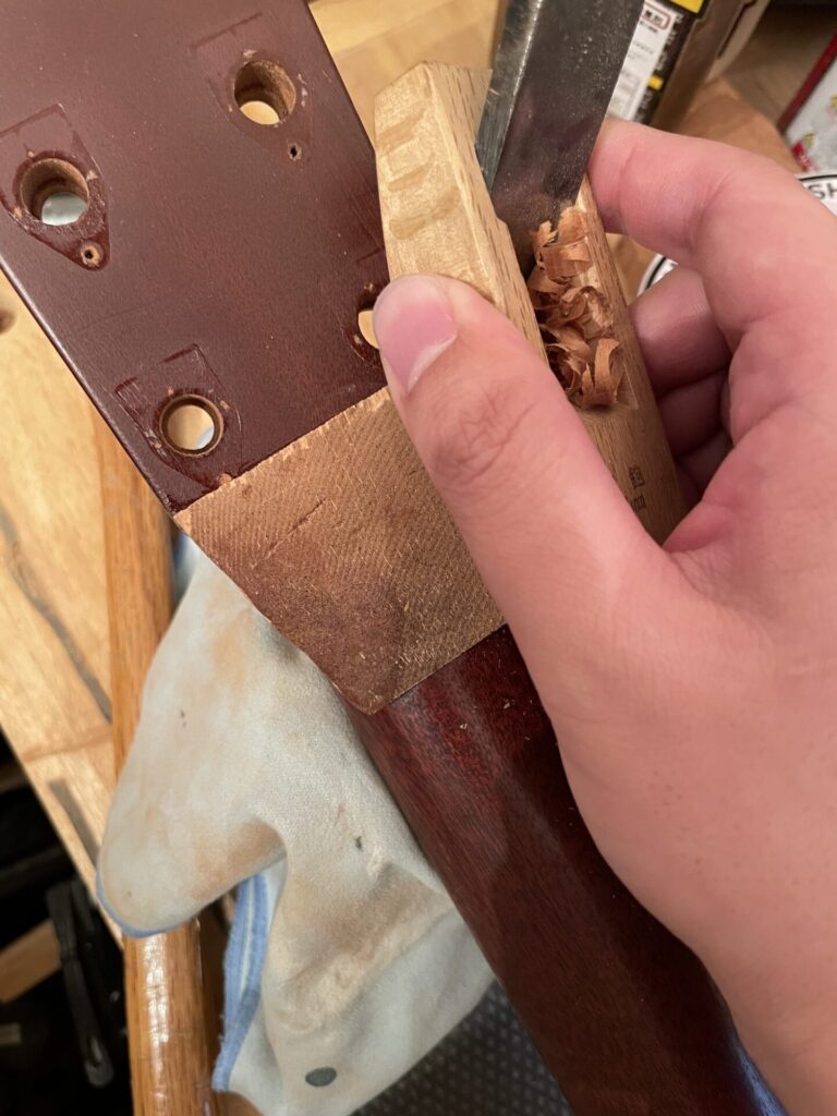 まずは木部同士の接着面積を確保するため、ネック折れ箇所を大胆に削ります。